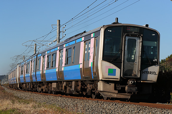 Background and Overview The entire Senseki Line, which was destroyed, heavily damaged, and flooded by the 2011 Tohoku earthquake and tsunami, was fully restored and reopened in 2015. In conjunction with this restoration, JR East introduced inter running services branded as the “Senseki Tohoku Line,” linking Sendai and Ishinomaki by connecting the AC electrified Tohoku Line and the DC electrified Senseki Line via a newly constructed unelectrified connecting line. To support these services, JR East developed the HB E210 series hybrid diesel multiple unit (DMU) trains in 2015.